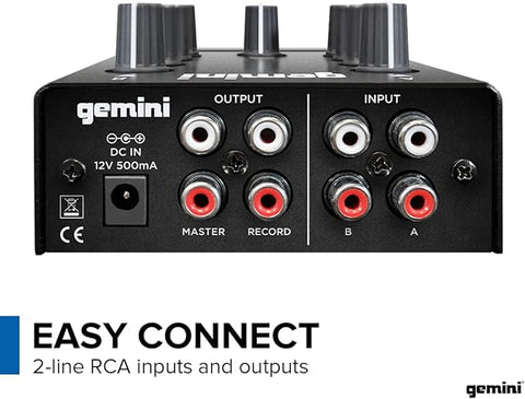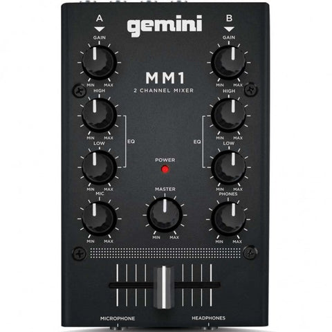 Il Gemini MM1 offre funzionalità pratiche in un design estremamente compatto. Questo mixer stereo a 2 canali estremamente portatile dà ai DJ il controllo che richiedono a un prezzo che possono permettersi. Con due ingressi RCA di linea e un'uscita master RCA, MM1 fornisce tutti i collegamenti necessari. Per creare un suono personalizzato, questo mixer è dotato di un equalizzatore rotativo a 2 bande su ciascun canale, che permette di mixare in modo articolato i bassi e gli alti delle tracce. E il controllo indipendente del Gain ti offre un controllo ancora maggiore quando crei il tuo mix. Il MM1 dispone inoltre di un ingresso microfono da 1/4" con controllo volume dedicato. Il volume delle cuffie MM1 consente di regolare i livelli alla cuffia da 1/4" senza modificare il mix complessivo. L'utilizzo delle funzionalità per preascoltare il tuo mix contribuisce a renderlo serrato e professionale per il pubblico. Per transizioni senza sforzo ed un mixaggio pulito da una sorgente all'altra, l'MM1 presenta un crossfader robusto e regolare.