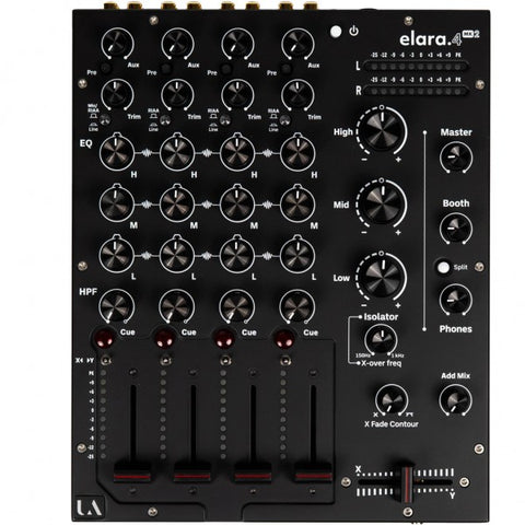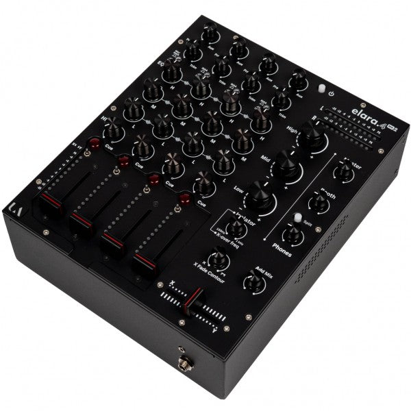 DJ mixer analogico a quattro canali, progettato e costruito in Inghilterra per chi è alla ricerca dei più alti standard in termini di prestazioni audio e artigianalità – combina una qualità audio eccezionale, controlli intuitivi e uno chassis robusto per offrire un'esperienza di mixaggio di livello professionale ai DJ che apprezzano sia la tradizione che l'innovazione – l’ELARA 4 Mk2 si distingue per il suo mix di calore analogico classico e design moderno – i quattro canali hanno ingressi phono e linea di alta qualità, garantendo una perfetta integrazione con una varietà di sorgenti audio – il layout ergonomico presenta fader lineari splendidamente bilanciati, controlli EQ precisi e un'interfaccia intuitiva, che semplificano la creazione di mix dinamici e coinvolgenti per i DJ – realizzato con meticolosa attenzione ai dettagli, l’ELARA 4 Mk2 utilizza solo i componenti più pregiati per garantire una riproduzione audio impeccabile e prestazioni affidabili. Il suo robusto telaio in metallo garantisce resistenza, mentre i componenti interni di alta qualità offrono il suono ricco e caldo che gli appassionati di musica analogica desiderano e cercano – la sezione di preascolto offre il monitoraggio pre-fader su ogni singolo canale, controlli split-cue e add-mix – ogni canale è dotato di un meter a 10 led e di un fader da 45 mm splendidamente pesato, con curva ultra lineare per un mixaggio preciso – un'esclusiva dell'ELARA 4 Mk2 è l'EQ/isolator master con controllo crossover variabile, progettato per completare l'EQ di ogni singolo canale e consentire una modellazione sonora altamente creativa - 2 ingressi phono/linea su ciascun canale, uscita master XLR bilanciata, uscite booth e aux con jack TRS da ¼", uscita rec con RCA, aux o insert master commutabili per una completa integrazione con effetti o unità esterne, ingresso microfonico con connessione XLR bilanciata – crossfader Innofader con contour variabile e routing selezionabile per canale tramite un interruttore a switch, che consente transizioni fluide e mixaggi creativi – che sia in un club, in studio o a casa, l’ELARA 4 Mk2 offre la versatilità e la qualità necessarie per esaltare i tuoi DJ set